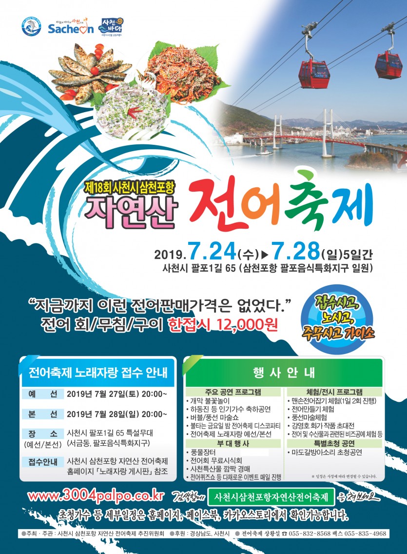 삼천포항 전어축제 추진위원회는 금어기가 해제되는 7월16일 이후 전국에서 최초로 잡히는 여름철 햇전어로 2019.7.24.(수)-7.28.(일)까지 5일간 경남 사천시 삼천포항 팔포음식특화지구 일원에서 제18회 사천시 삼천포항 자연산 전어축제를 개최합니다.