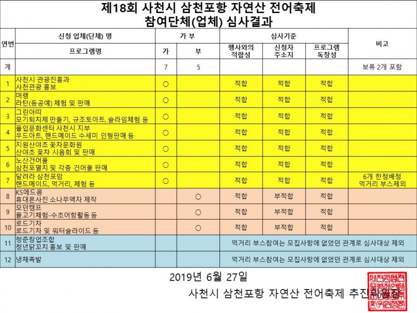 제18회 사천시 삼천포항 자연산 전어축제 참여단체(업체) 심사결과 페이지 정보 작성자 관… 작성일19-06-27 10:42 조회5,342회 관련링크 이전글 다음글 목록 본문 참여단체(업체)에 선정되신 분들께는 사무국에서 별도 연락을 드리도록 하겠습니다. 이전글 다음글 목록