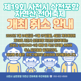 2020년 7월 24일(금) ~7월 27일(월), 4일간 개최예정된 제19회 사천시 삼천포항 자연산 전어축제는 코로나 19(COVID-19) 예방 및 확산 방지를 위하여 취소 되었음을 알려드리며, 내년에 더 좋은 프로그램으로 준비하여 찾아뵙겠습니다.